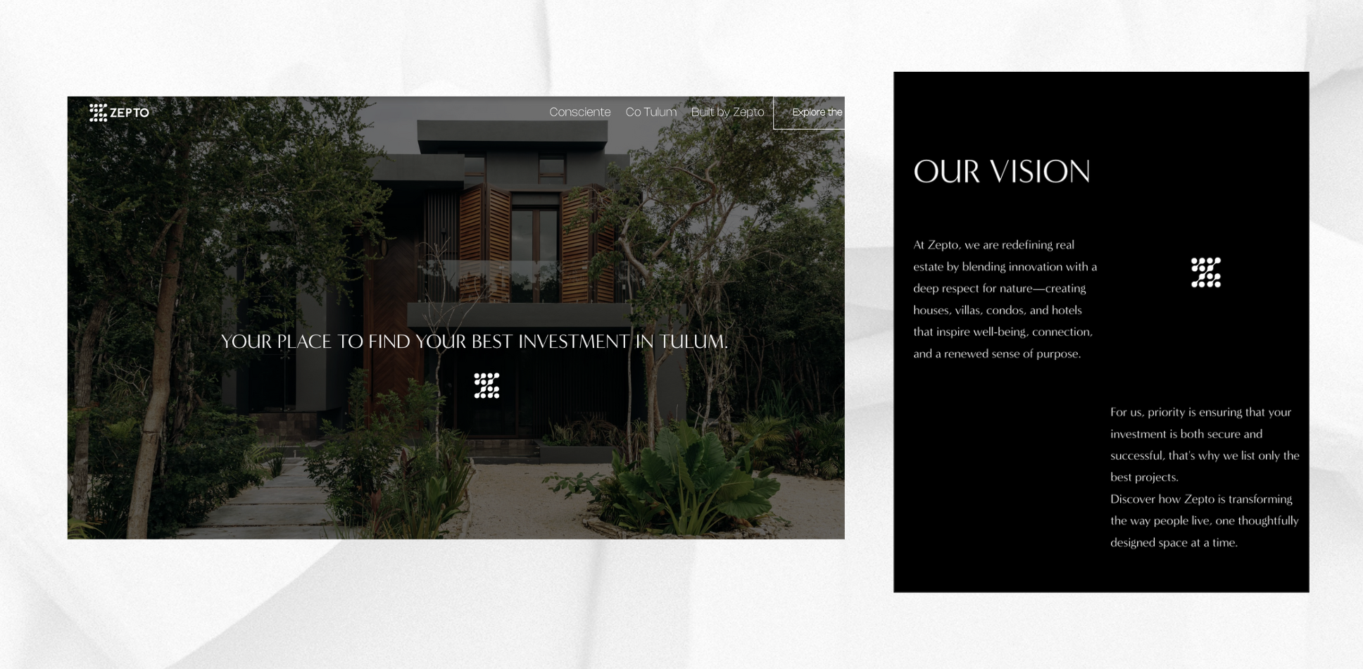 Zepto is an ongoing client. As a real estate developer in Tulum, we are curating the brand identity, graphic design, architectural outputs, and web design.